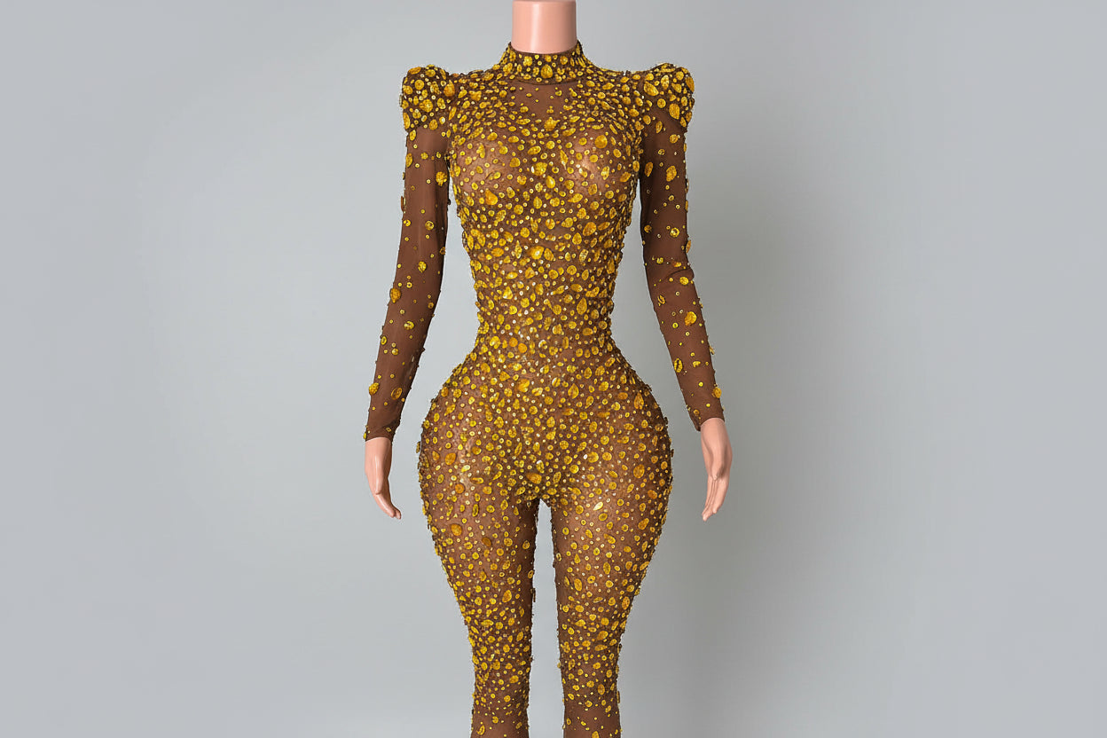 Step into ultimate luxury with the Ella Diamante Bodysuit, designed to turn heads at any event. Made from high-quality mesh fabric, this stunning bodysuit is fully embellished with dazzling rhinestones and crystals in various sizes, creating a radiant, sparkling effect. Its body-hugging silhouette, combined with dramatic embellishments, accentuates your curves, making this piece truly glamorous.