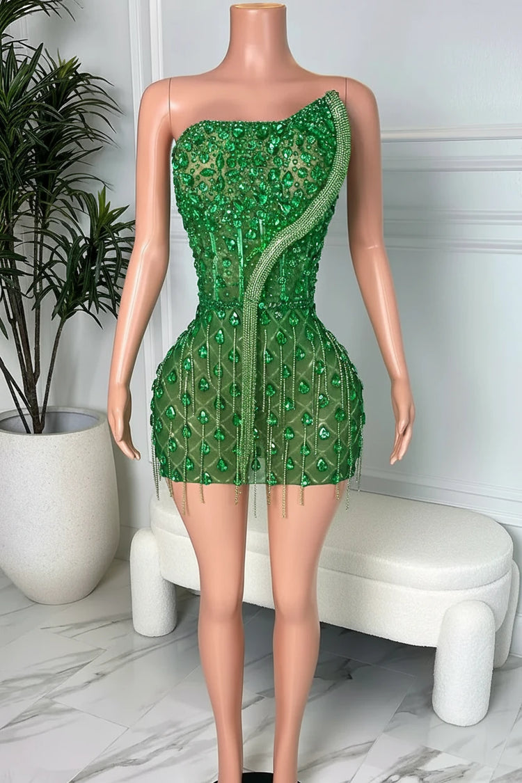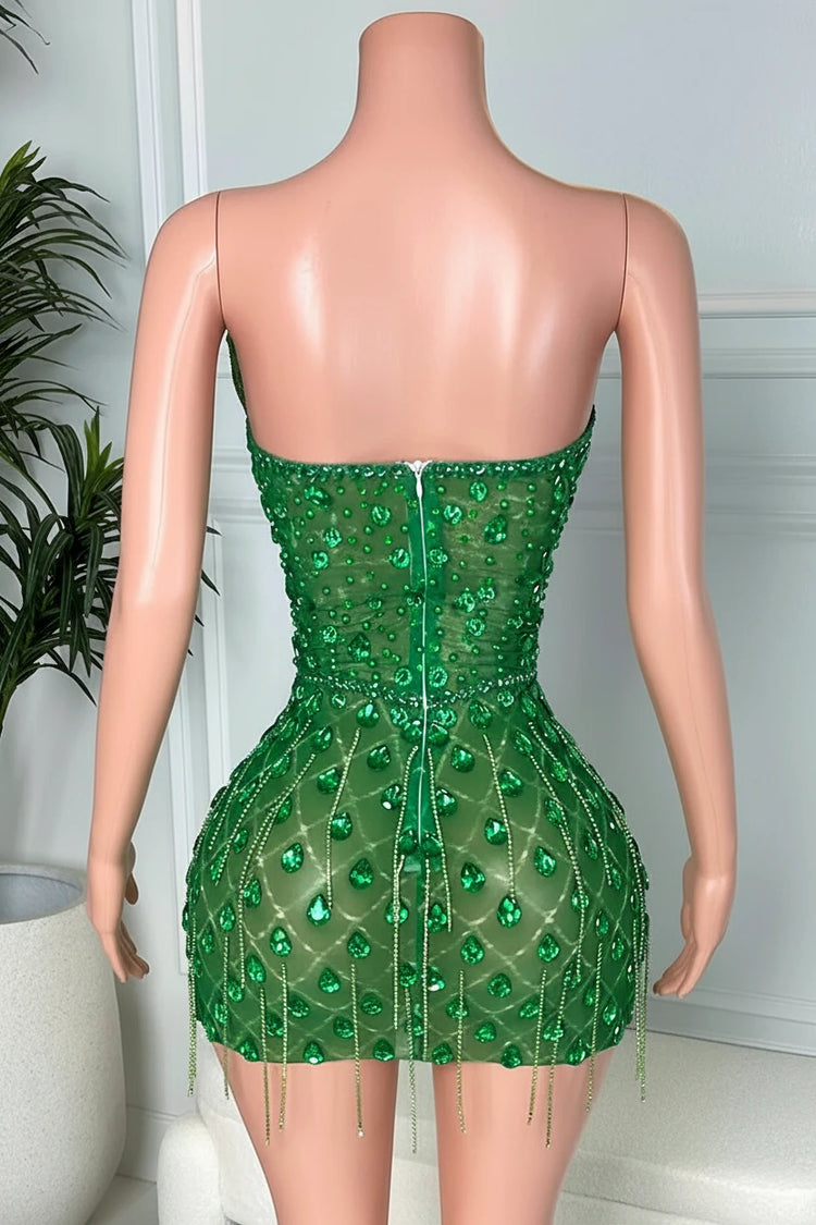 The bodice is lavishly adorned with shimmering red gemstones, creating a high-impact, glamorous shine. A diagonal beaded trim sweeps across the front, adding dramatic structure and couture-level detail. The mini skirt stands out with its lattice arrangement of gemstones, finished with delicate dangling bead chains that move beautifully with every step.