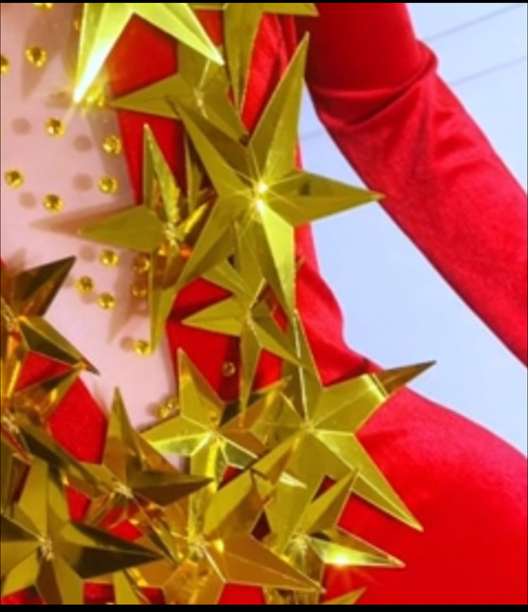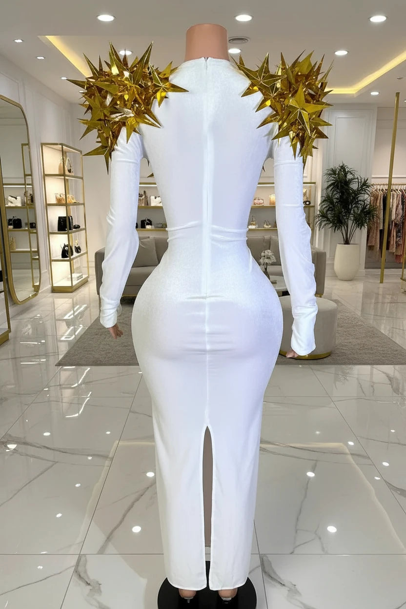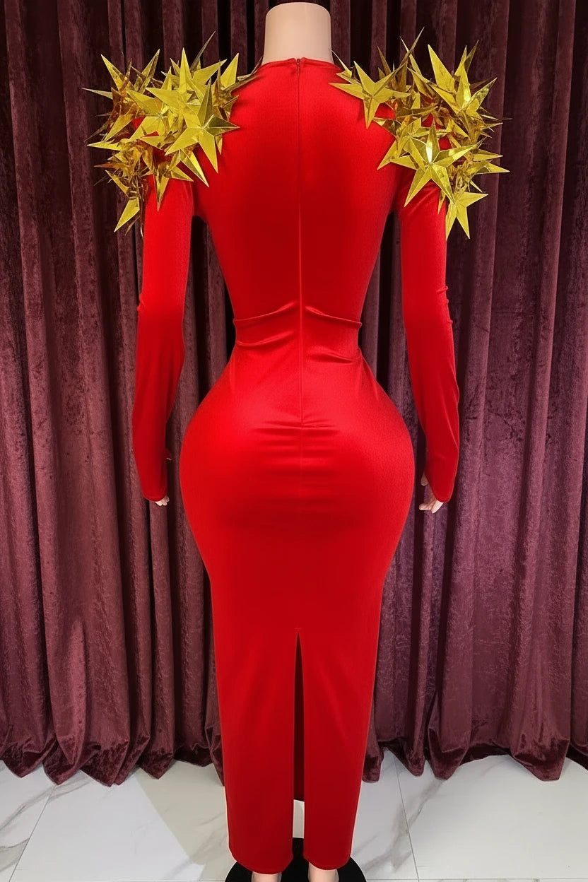 Crafted from rich velvet fabric, this floor-length gown features a bold plunging illusion neckline that highlights the décolletage while maintaining refined sophistication. The shoulders and neckline are adorned with 3D metallic gold star embellishments, creating a radiant, otherworldly sparkle that commands attention.