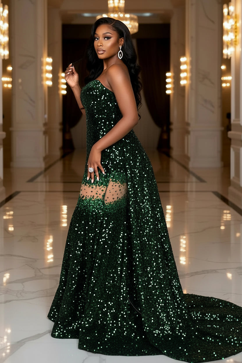 This emerald green evening dress is your go-to for unforgettable nights. Own the room in sequins, curves, and confidence.