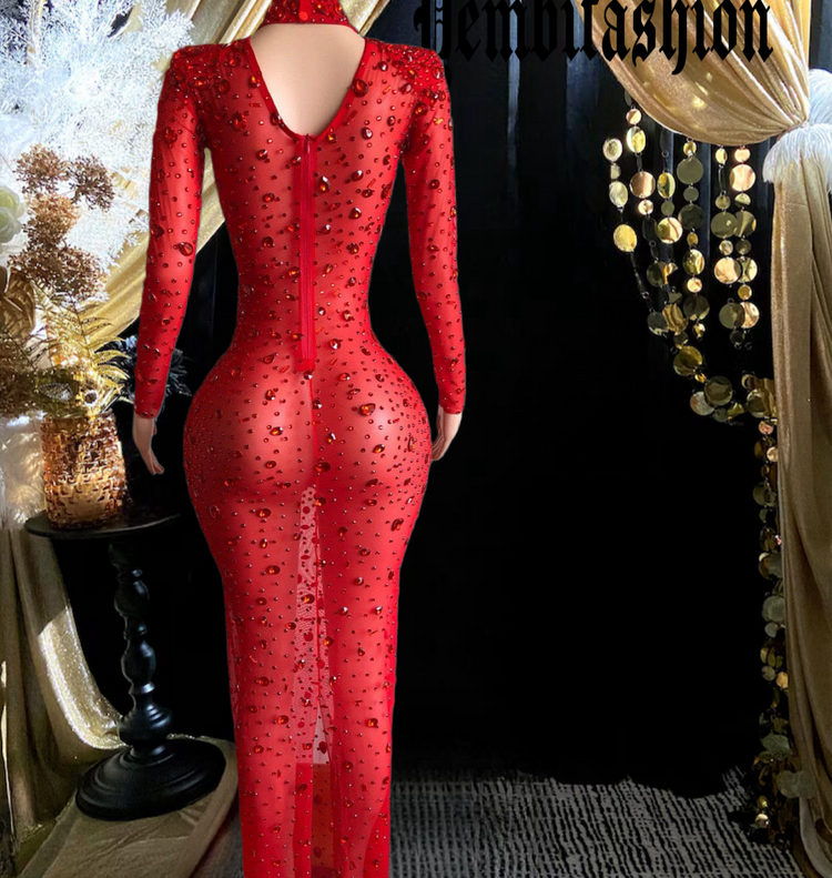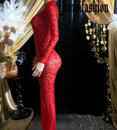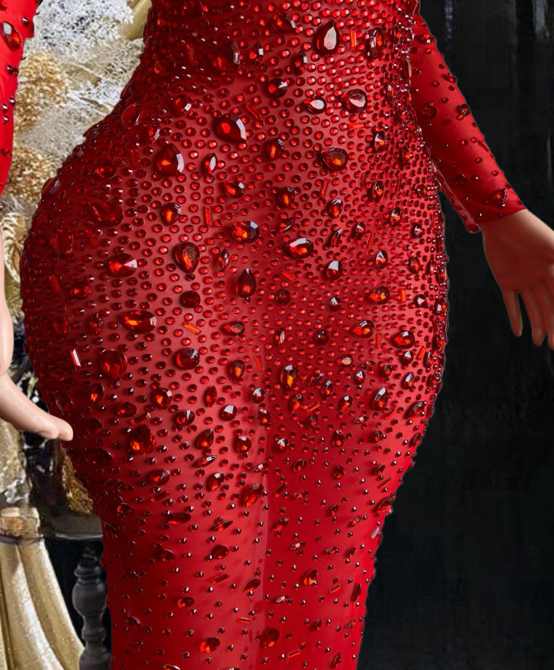 Shine like the star you are in this Red Crystal Long Dress. Designed with luxurious detailing, this stunning long sleeve dress features intricate rhinestone embellishments that add a sparkling touch to your elegant evening look. Whether you're attending a gala, formal event, or a glamorous night out, this rhinestone dress guarantees you’ll make a statement. The figure-flattering silhouette and the shimmering rhinestones cascading throughout the design ensure that all eyes will be on you. Elevate your style with a piece that embodies sophistication and glamour