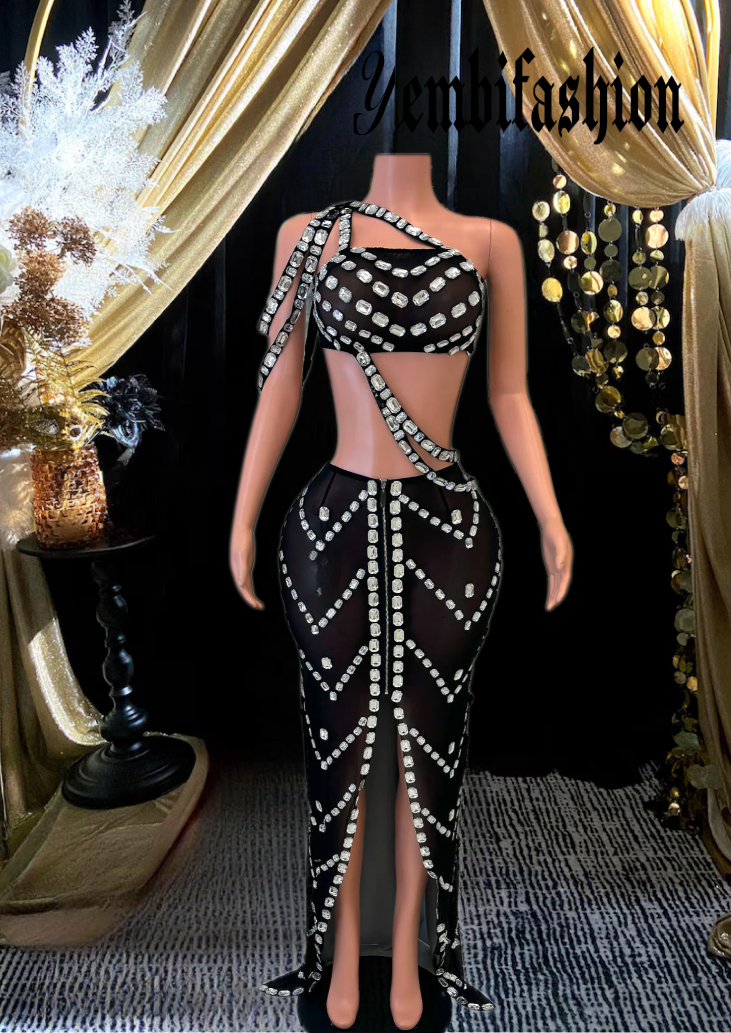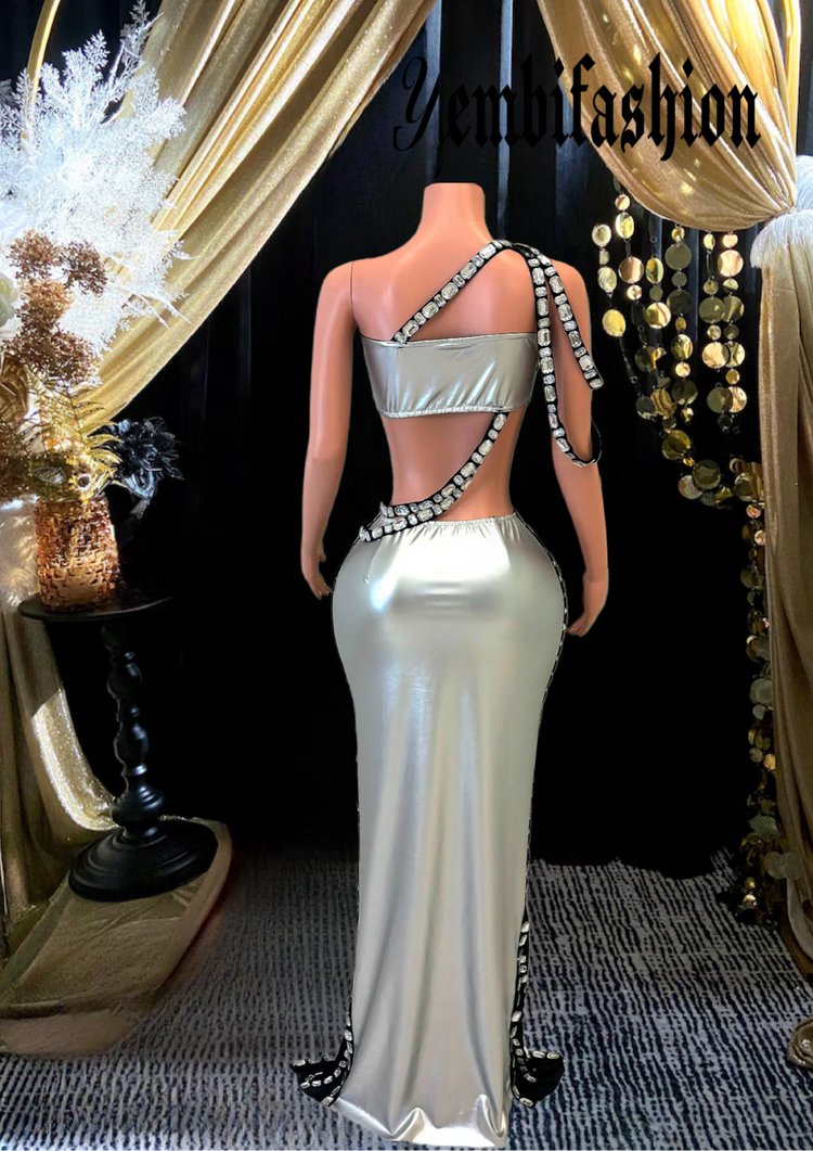- Design: The bandeau-style top has one strap crossing over the shoulder and wrapping around the waist, while the skirt is adorned with rhinestones in geometric patterns, creating a striking and glamorous look.