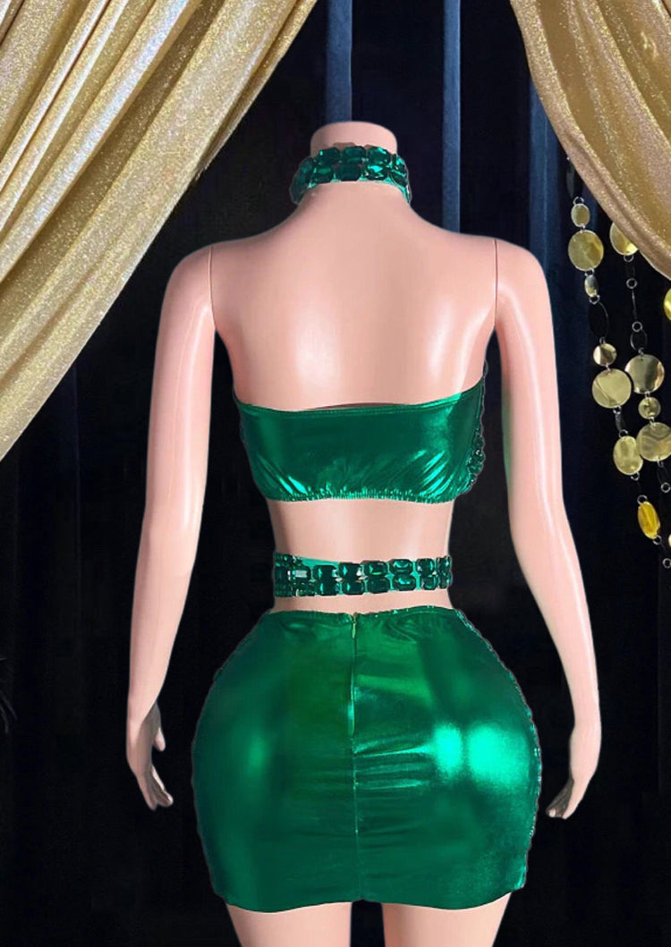 Get ready to shine in this Ethan Set Dress. Made from a sleek spandex material, this set features beautiful big green rhinestone decorations on both the top and skirt. Perfect for any occasion from a birthday dinner to a sexy date night or girls' night out. Order now and turn heads