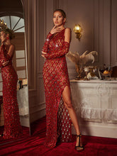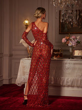 Eve One Shoulder Sequin Crystal Maxi Dress With Gloves In Red