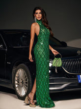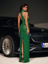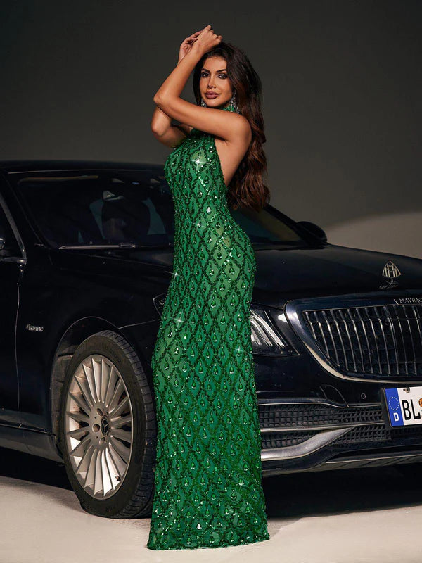 Make an entrance with the Liora Sequin Crystal Maxi Dress In Green. Featuring an all-over sequin design and exquisitely-embellished crystals, this glamorous dress will have you sparkling from head to toe. A back split creates a timeless silhouette that's perfect for any special occasion.
