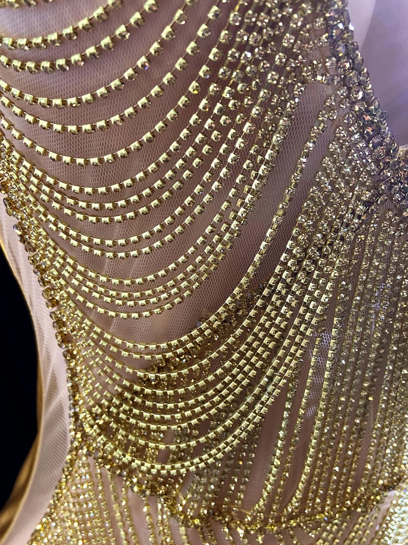 “Gold Rhinestone Chain Dress - Stunning body chain dress with rhinestones, perfect for glamorous occasions.