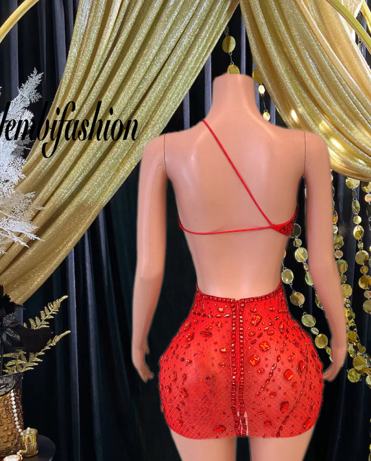 Stand out in the crowd with the laura One Shoulder Rhinestone Embellished Mini Dress! This stunning dress features eye-catching rhinestone embellishments and a unique one shoulder design. Be the center of attention and feel confident and stylish in this must-have dress it’s crafted for a comfortable yet figure-flattering fit, making it an unforgettable addition to your wardrobe