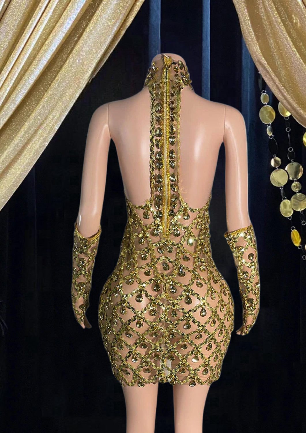 Turn heads and dazzle the crowd with our Gold Rhinestone Dress, a stunning mini dress that radiates elegance and sophistication. This dress is adorned with shimmering rhinestones that catch the light perfectly, making it the ultimate midnight dress for parties, special occasions, or glamorous nights out.