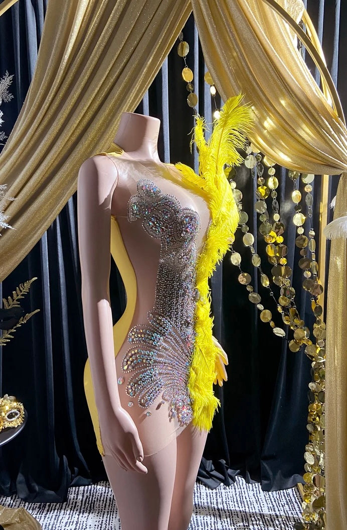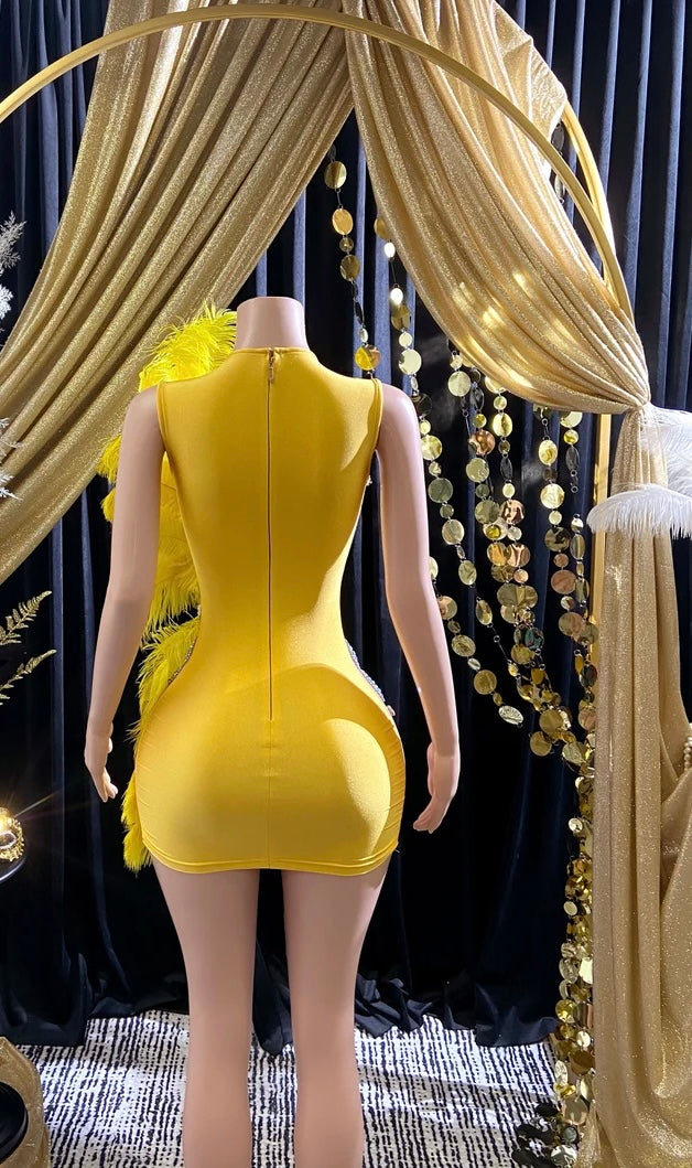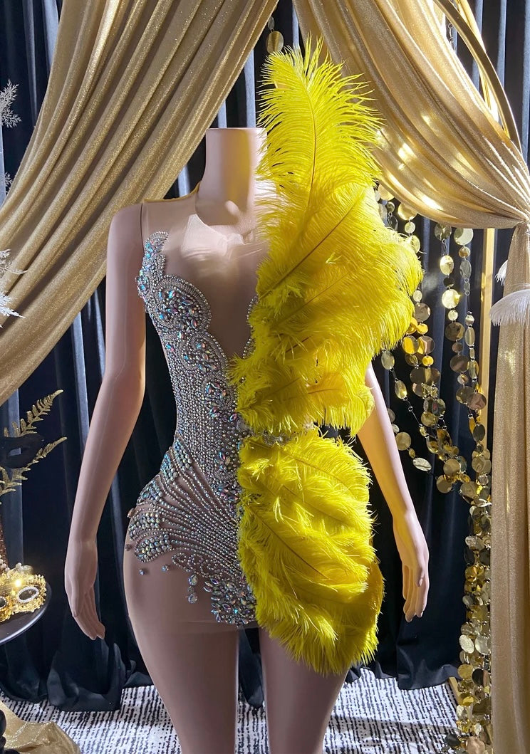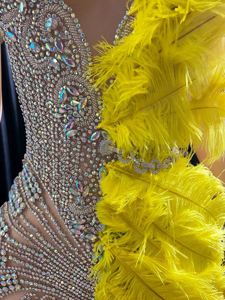 Luxury Gold Feather Rhinestone Birthday Prom Evening Dress