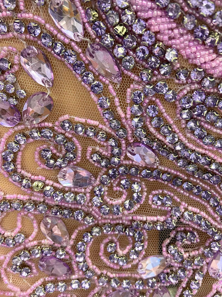 . Embellishments: Adorned with purple rhinestones arranged in ornate patterns for a bold, luxurious look.