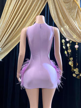 . Design: purple mini dress with a fitted silhouette and intricate sheer detailing.