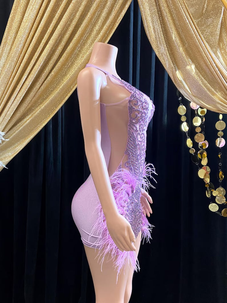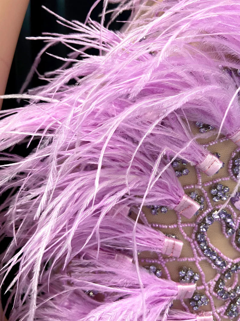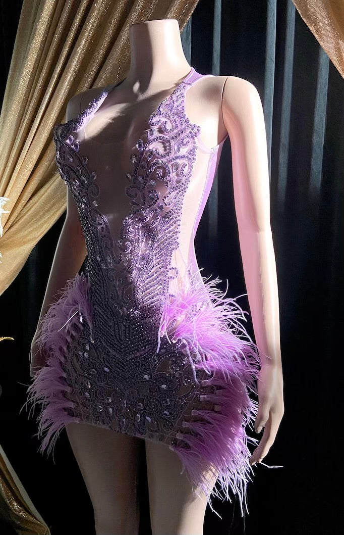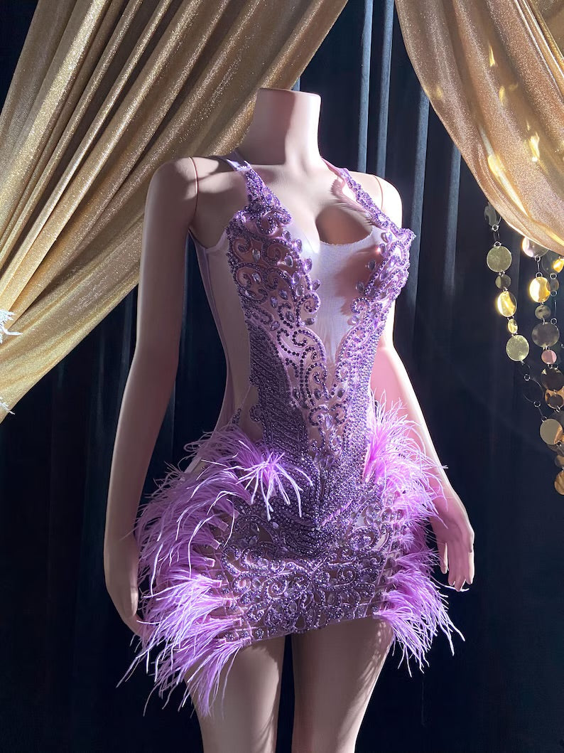 . Details: Accentuated with vibrant purple feathered accents at the hips, adding drama and texture.