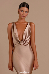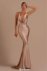 Make a stunning entrance in this Deep V-Neck Sleeveless Prom Dress. The elegant long mermaid silhouette flatters every curve, while the dropped back adds a touch of glamour. Perfect for prom or special occasions, this dress offers timeless sophistication and unforgettable style.
