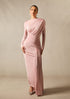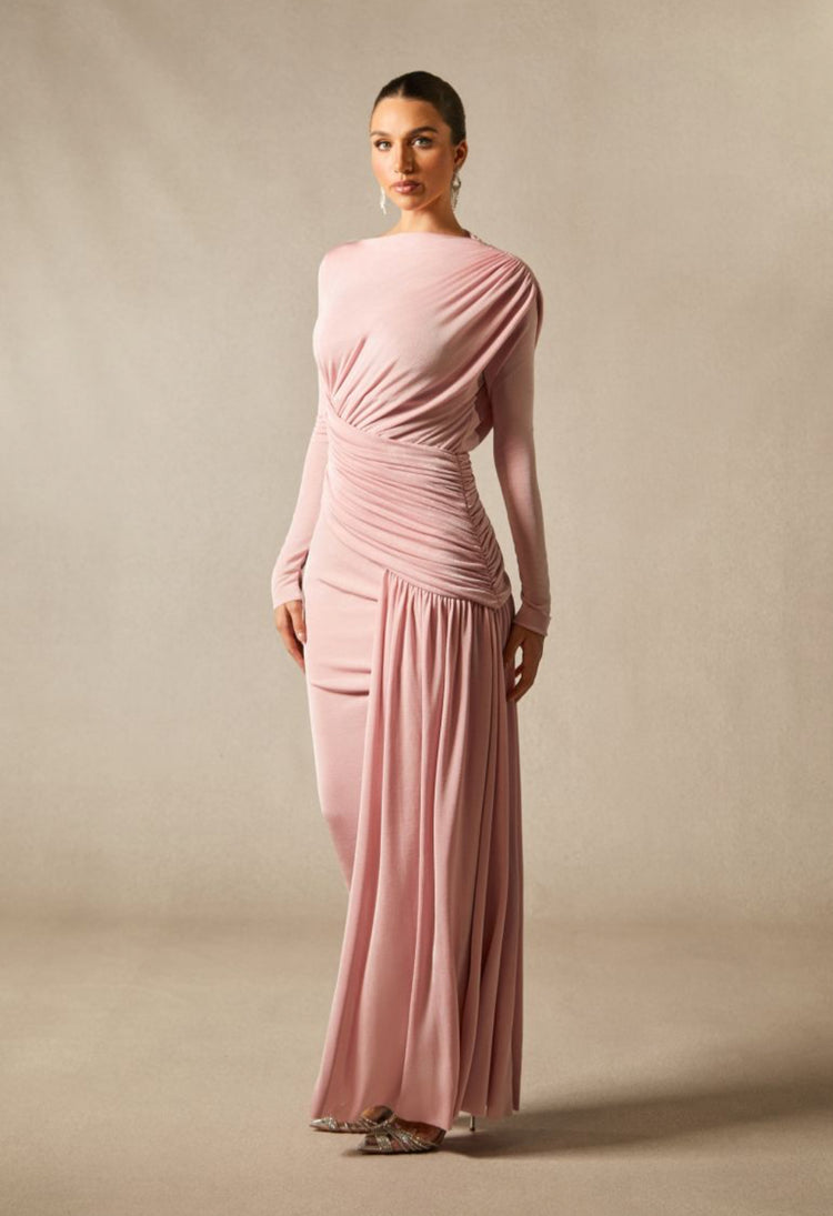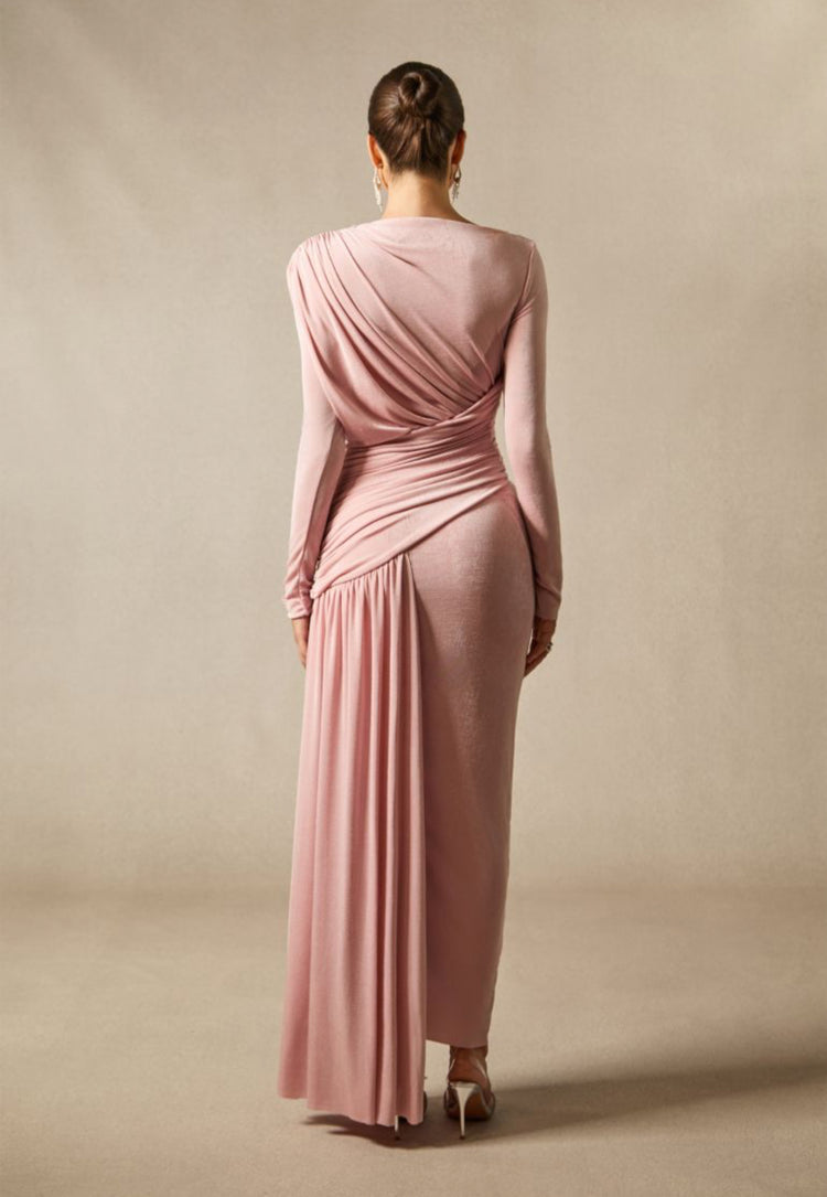 Long Sleeve Boat Neck Maxi Dress – Draped Waist Evening Gown with Side Gather