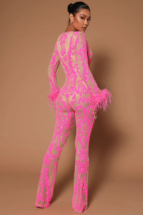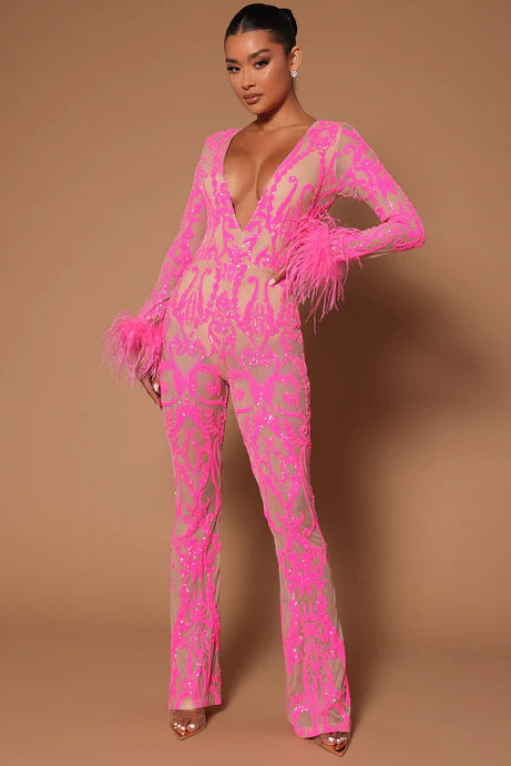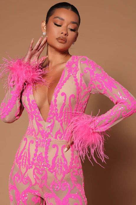 Shine bright in our Pink Sequin Feather Jumpsuit, designed to steal the spotlight at any event. This glamorous one-piece features dazzling sequins, a flattering fitted silhouette, and luxurious feather trim that adds drama and elegance. Perfect for parties, night outs, birthdays, or special events, this jumpsuit offers a bold, fashion-forward look that turns heads. Step into the spotlight with confidence and sparkle all night.