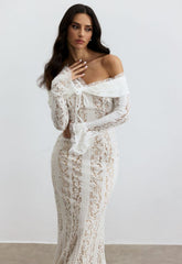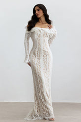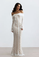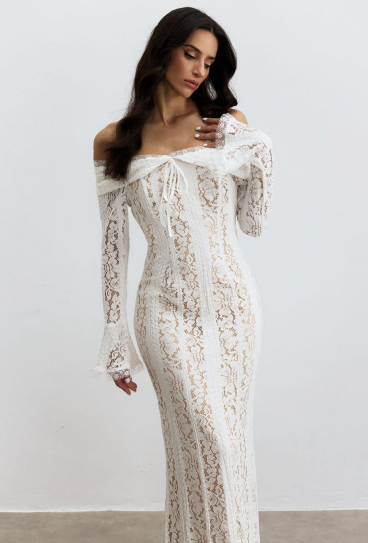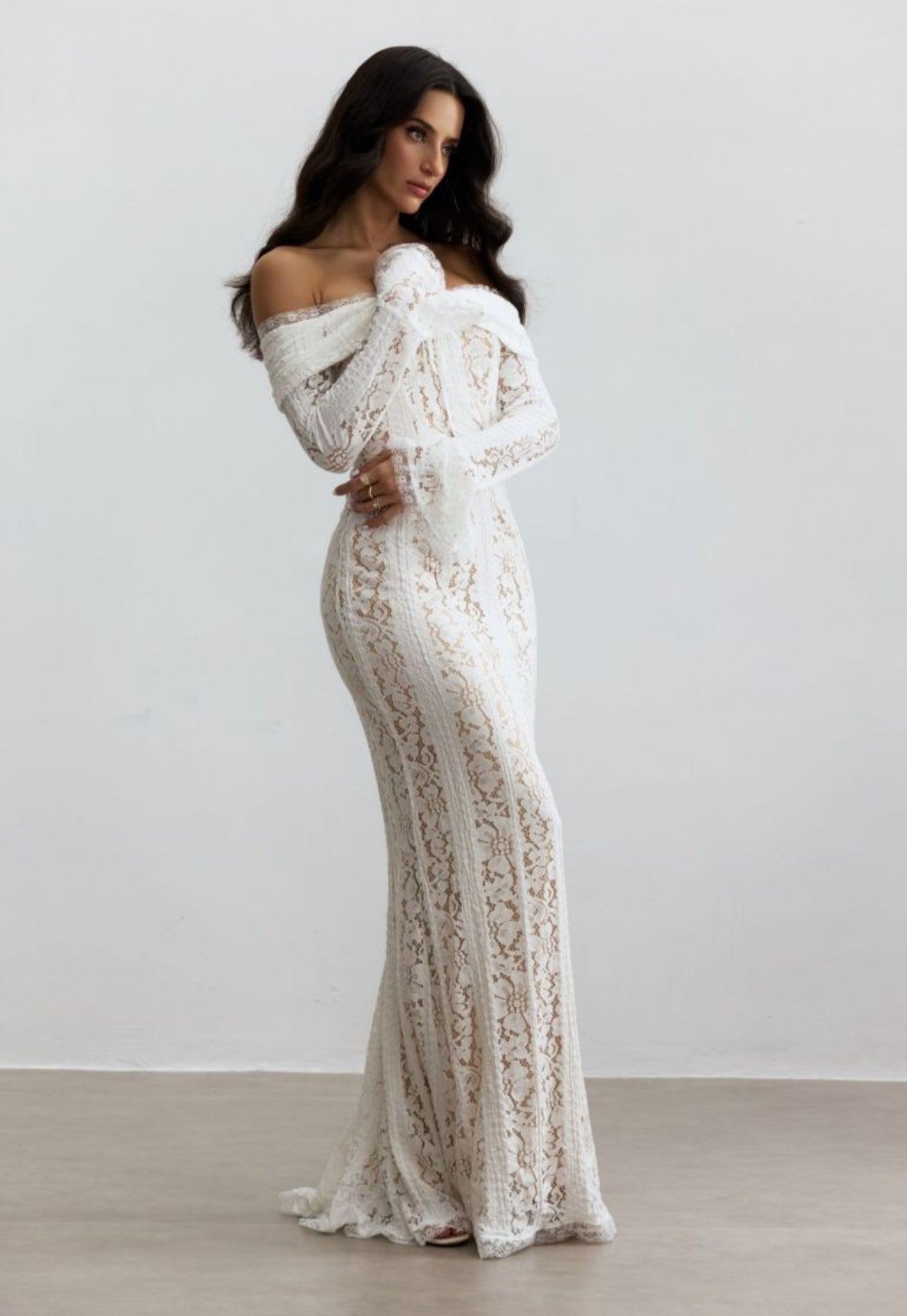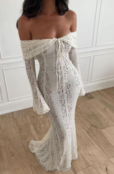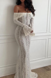 Turn heads in this Mermaid Lace Maxi Dress, designed with a dramatic fishtail hem and a romantic off-shoulder neckline. The flowing flare sleeves add elegance, while the high-stretch lace fabric ensures comfort and a flattering fit. Featuring a maxi length with a slight train, this gown balances sophistication and allure, making it perfect for weddings, proms, evening parties, and formal occasions.